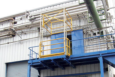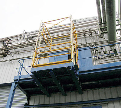Barrière-écluse aménagée sur une terrasse suspendue et décalée permettant de maintenir l'espace de circulation arrière sur la mezzanine.